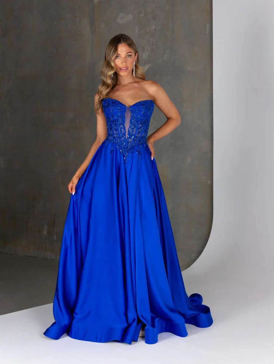 Make a lasting impression in our breath-taking Alpha formal dress by Tania Olsen Designs -where timeless romance meets sculpted sophistication. Designed to enchant from every angle, the strapless illusion corset bodice showcases intricate lace appliqué, supportive boning, and a subtle mesh insert between the bust, striking the perfect balance between allure and elegance. With built-in bra cups for effortless support, this gown promises both comfort and confidence.