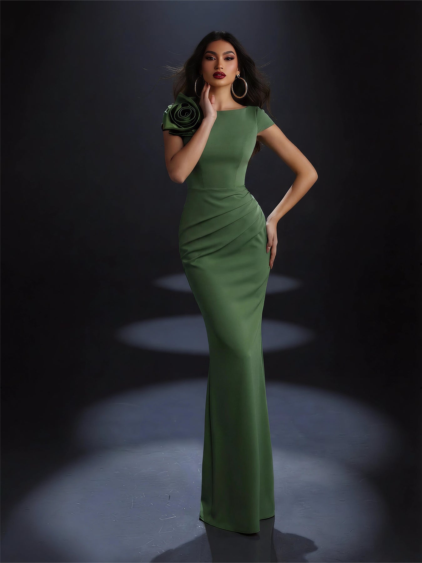 A statement floral shoulder detail adds a dramatic touch and can be removed for a more minimalist, sleek style, giving you two elegant looks in one gown. Soft draping through the waist enhances the figure, creating a flattering and sculpted shape.