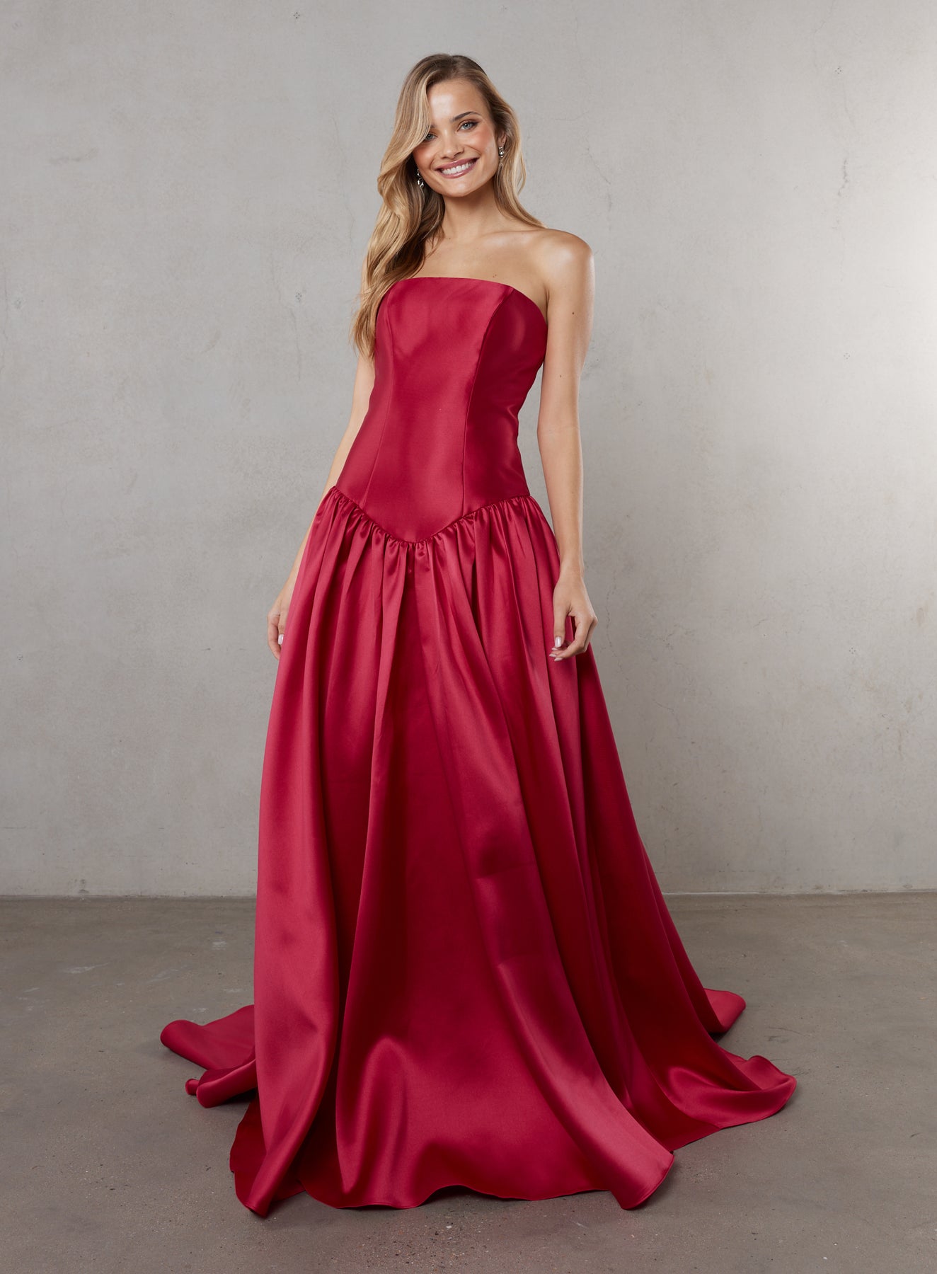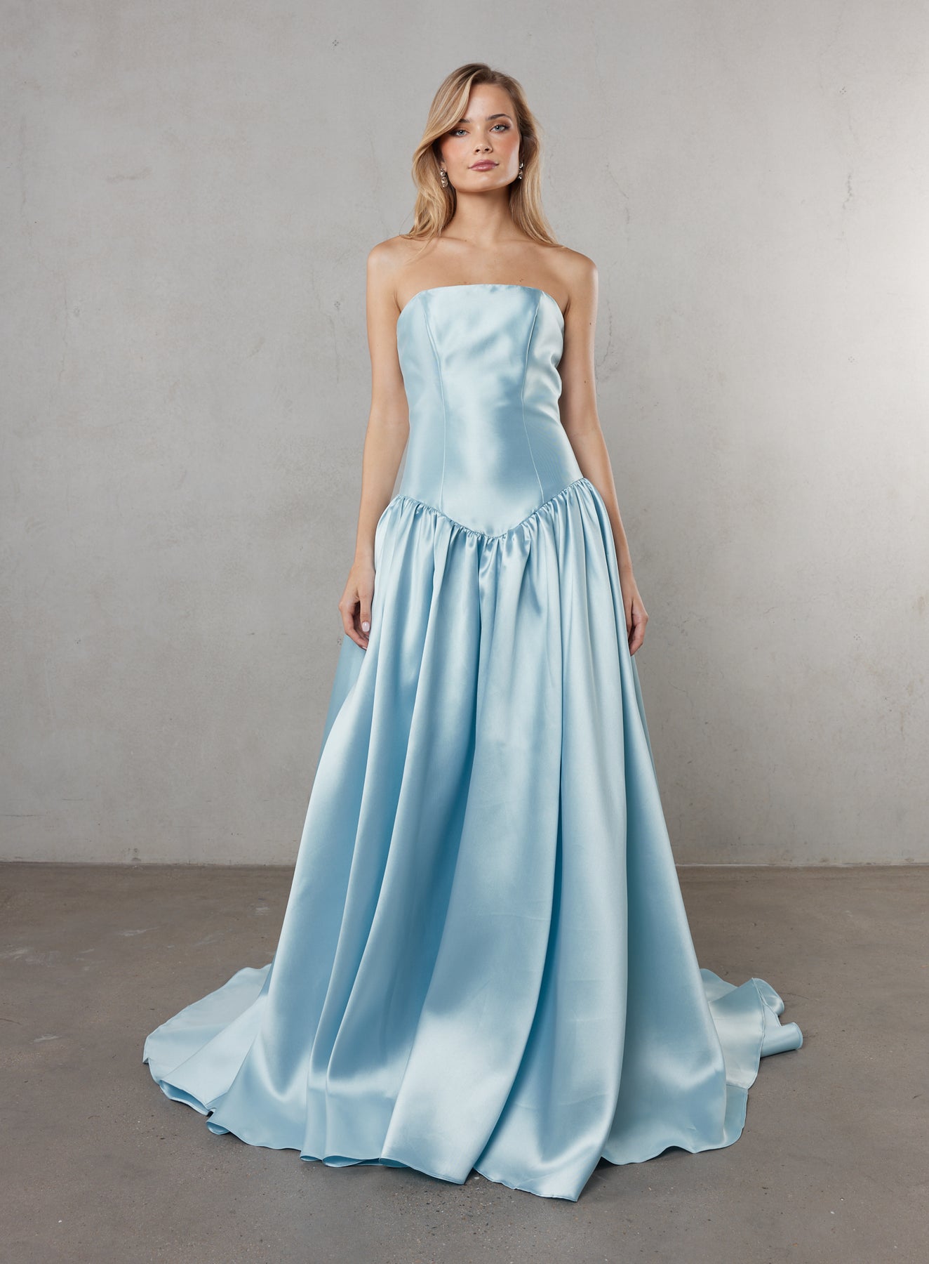 A drop waist elongates the torso and accentuates the figure, flowing seamlessly into a dramatic A-line skirt with precise pleat detailing that creates graceful volume and movement. Finished with an invisible back zip, this gown captures the essence of refined luxury—perfect for formal occasions, evening galas, or modern bridal moments.
