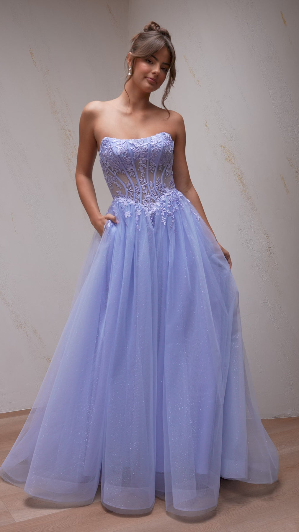 - A-line gown with full gathered glitter tulle skirt