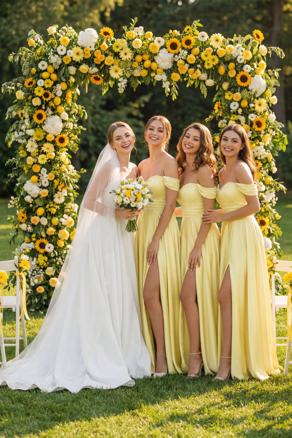 Indulge in the ultimate feminine look with the off shoulder sweetheart neckline, cinched waist, and graceful A-line skirt. A front leg slit and hidden pockets add functionality to this dreamy dress.