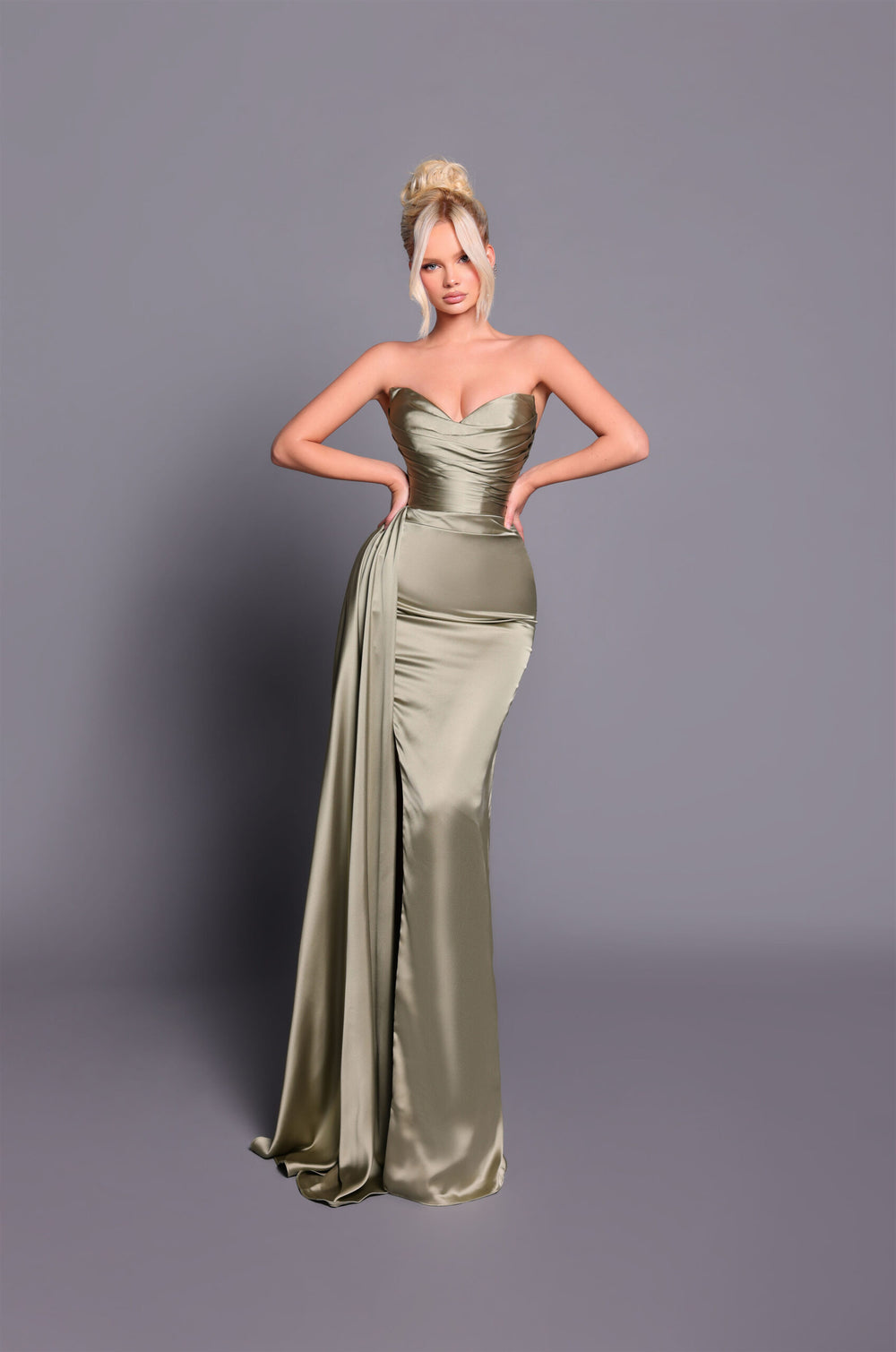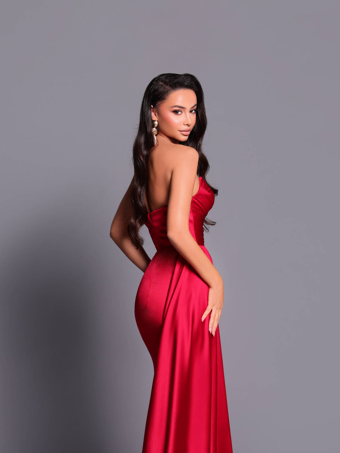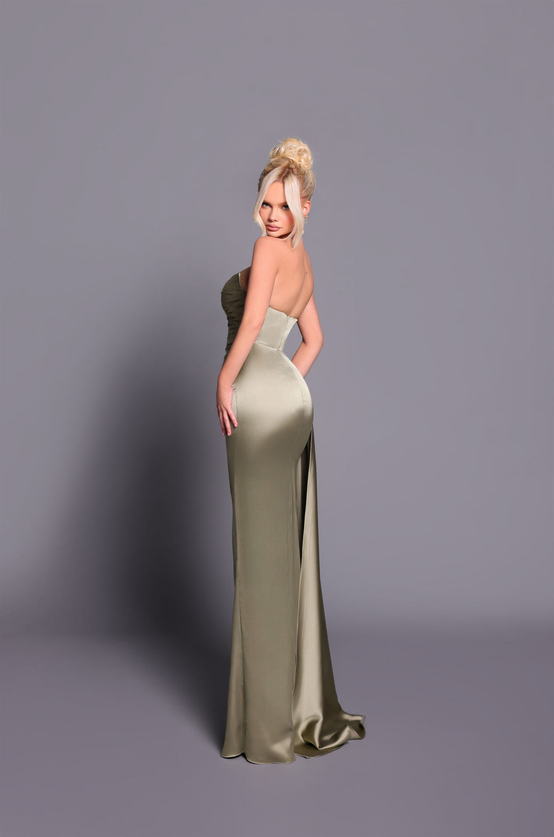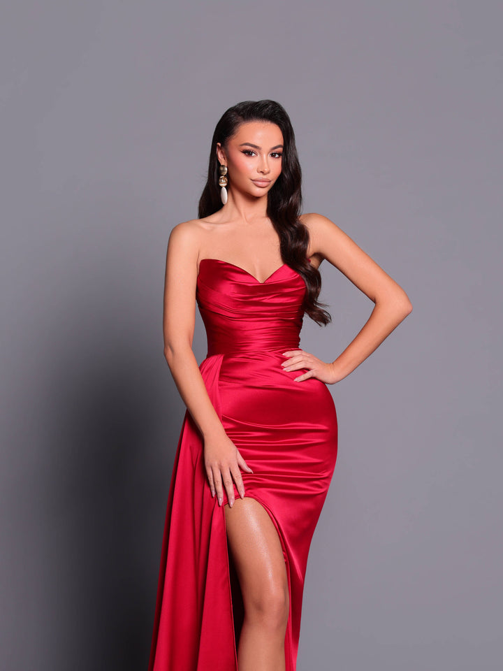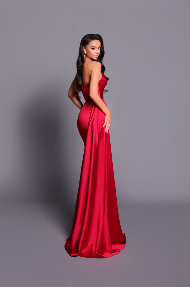 The Nicoletta NBM2001 Annie Dress combines sophistication and style with a strapless design, ruched detailing, and a fitted silhouette. Additionally, the dress features a right leg split and a drape side overlay, creating a statement-making look.