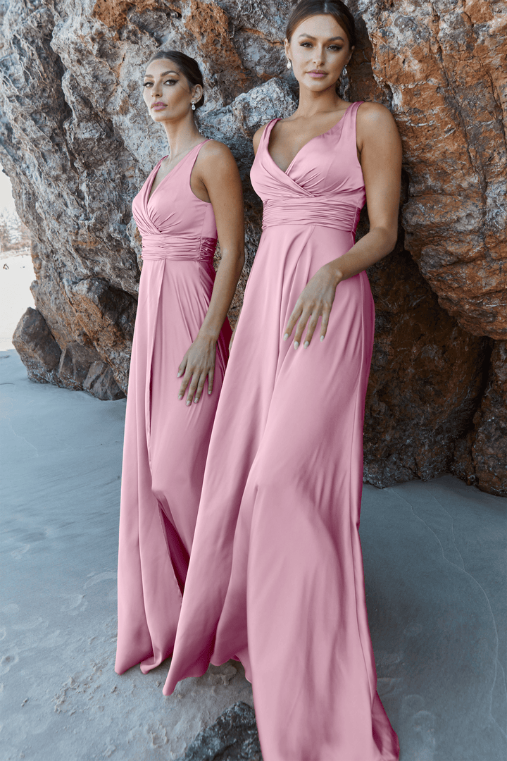 The Sakura TO881 bridesmaid dress resonates modern elegance and understated glamour! Featuring a softly pleated V-neck bodice with a mid-V back and bra-friendly straps, the Sakura is perfect on her own or mixed and matched within our light satin range. The A-line skirt falls from a pleated waistband and features an overlapping leg split for added movement.