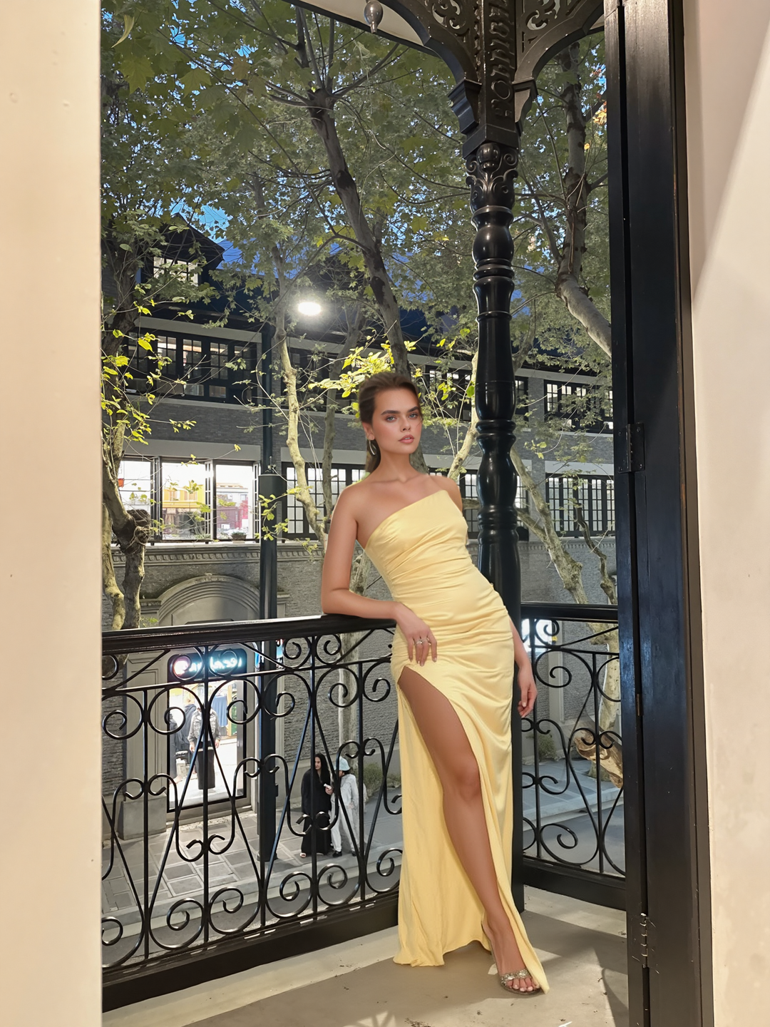 The Taipei PO914 formal dress by Tania Olsen Designs will have you manifesting red carpet parties in no time. The Taipei features a strapless, pointed corset bodice with an asymmetric neckline which sits atop some gorgeous gathering through the waist. This dress has a long, floor length skirt which perfectly contrasts the thigh high leg split. The Taipei is crafted from a soft satin fabric that is lightweight and amazingly comfortable to wear.