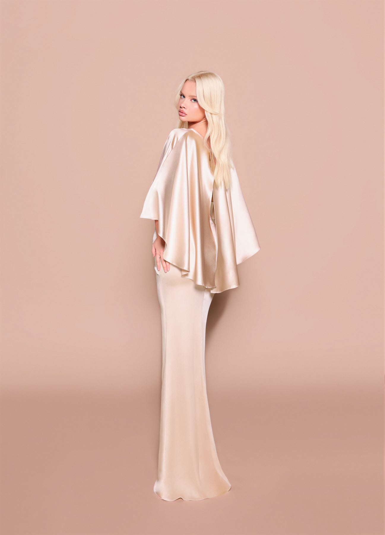 Designed to drape effortlessly over the shoulders, this flowing cape creates graceful movement while adding elegant coverage. Crafted from luxurious satin with a soft sheen, it elevates any gown instantly.