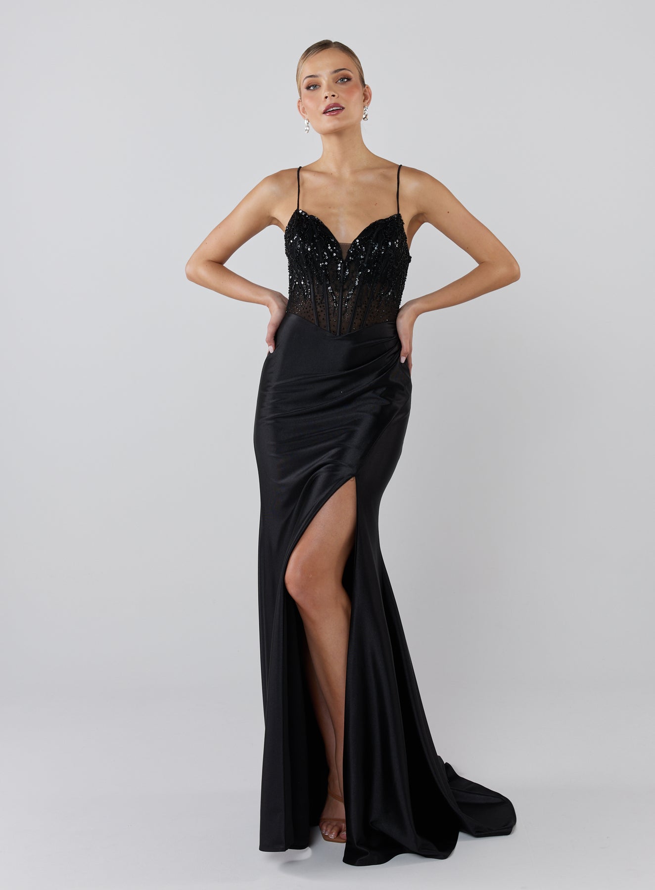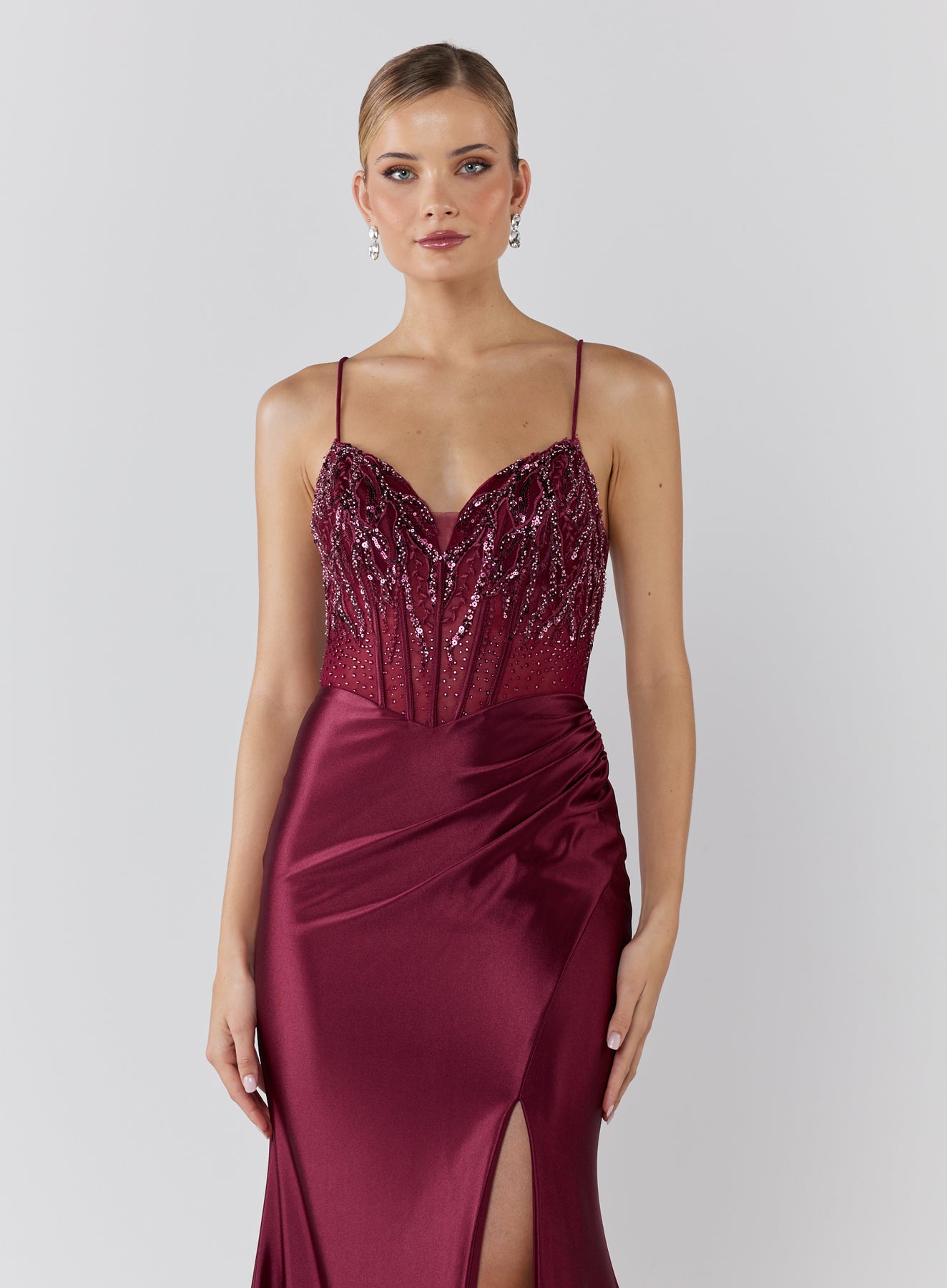The Carmella Formal Dress is a fitted, full-length gown crafted from stretch satin for a sleek, contoured silhouette. The skirt features a thigh-high split and ruching from one hip, adding movement and flattering definition.