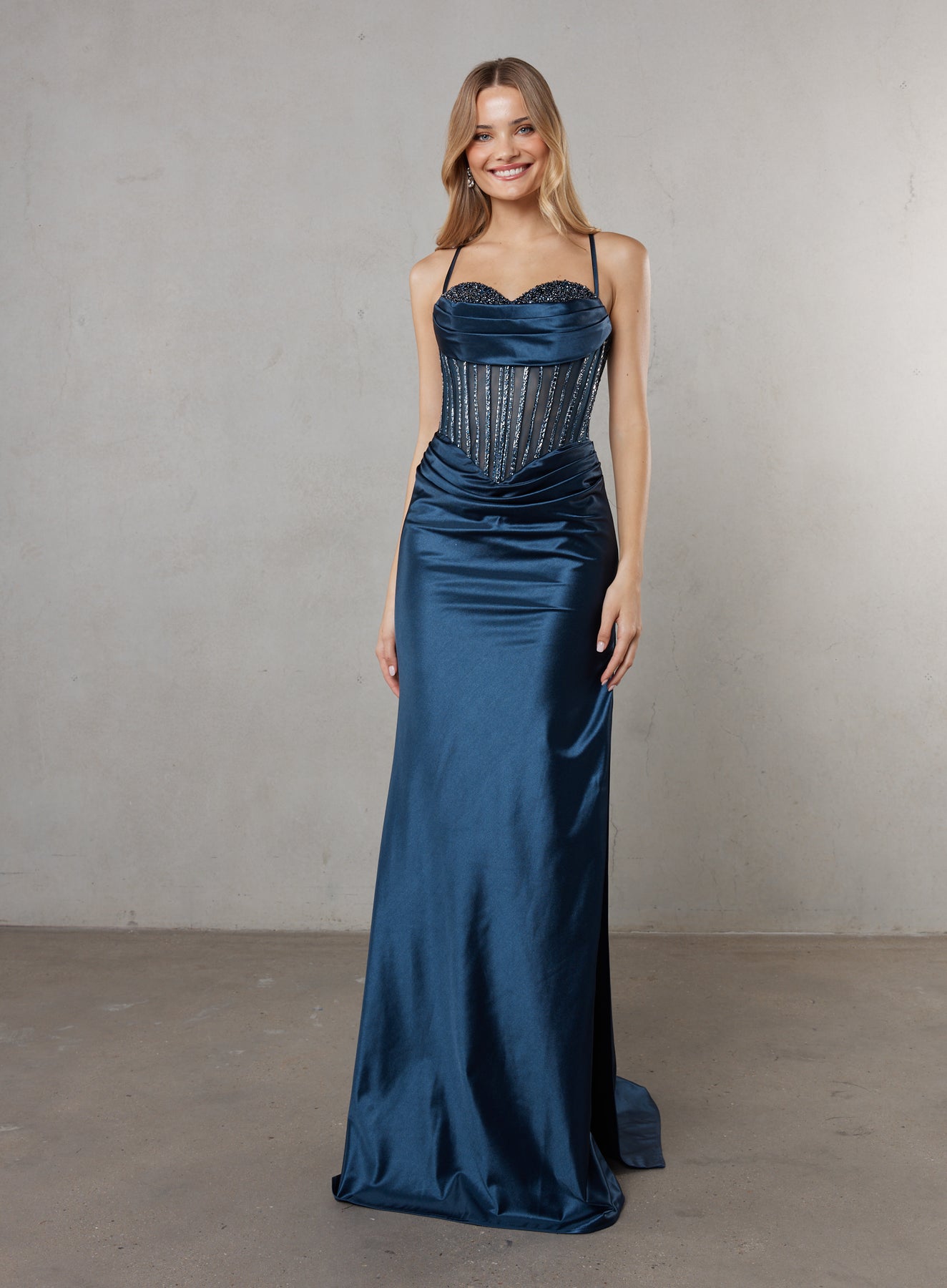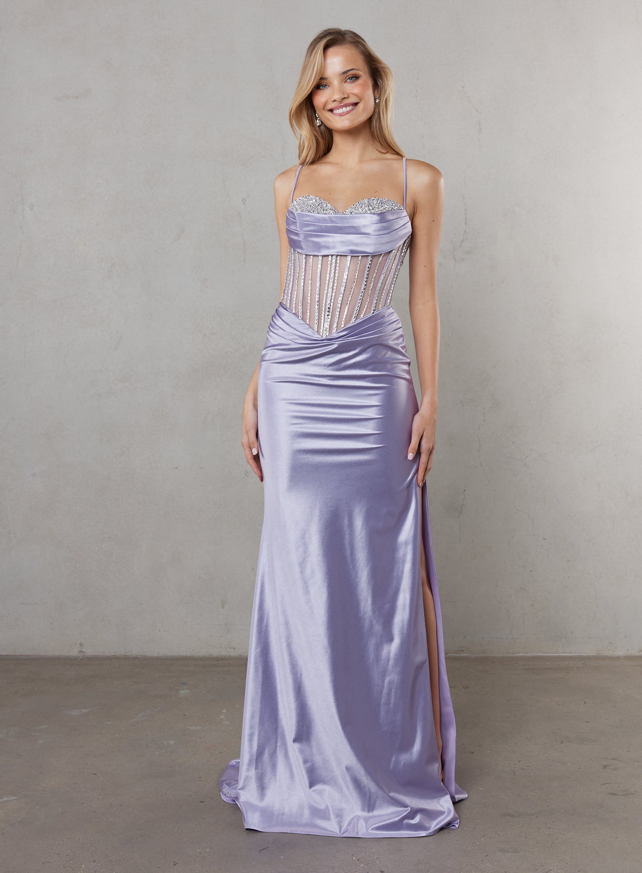 Dazzle in our Floretta formal dress by Poseur, crafted to accentuate every curve with refined elegance. The fitted silhouette features an illusion corset bodice adorned with beaded trimming and built-in bra cups for structured support and a touch of sparkle.