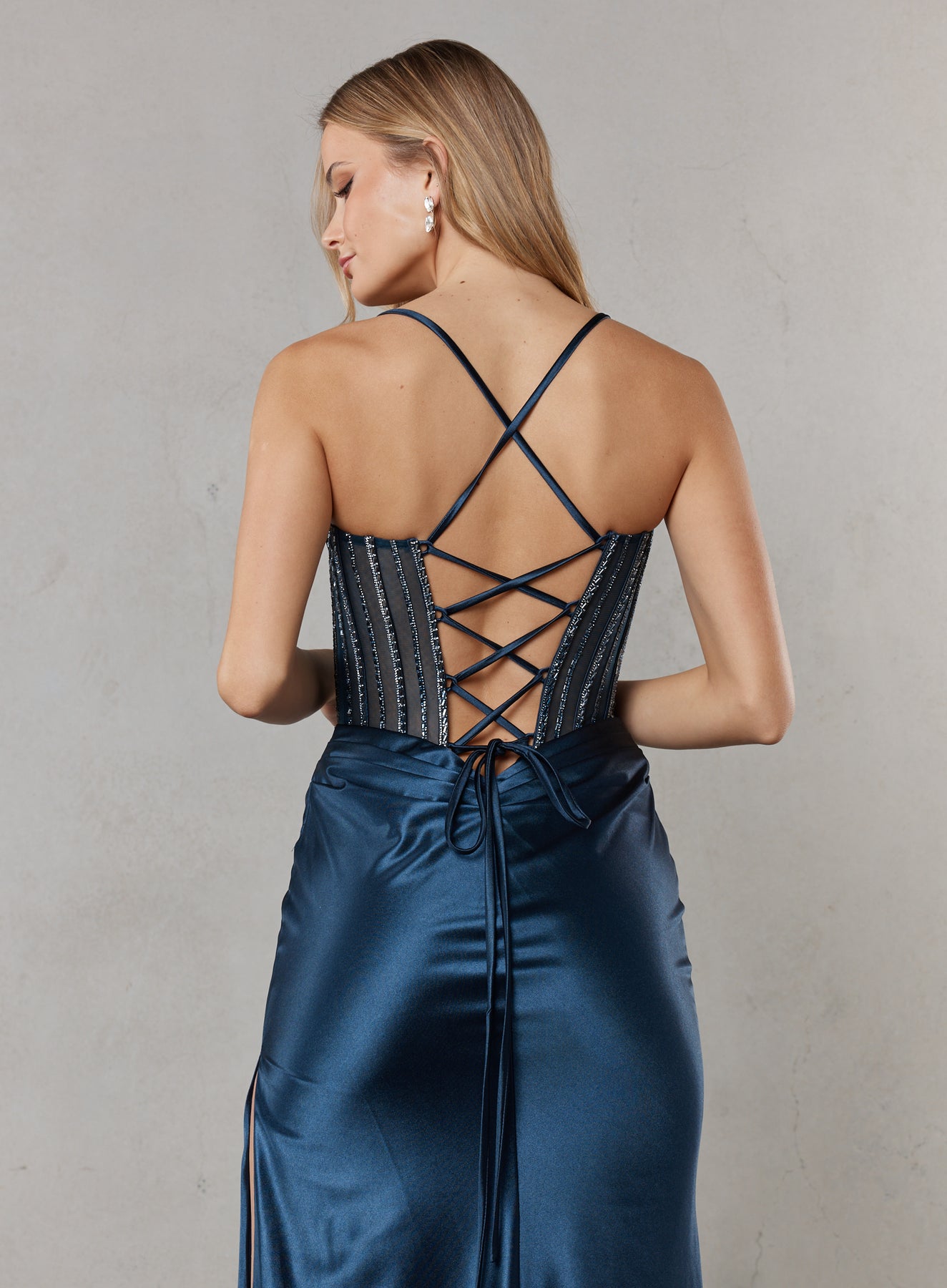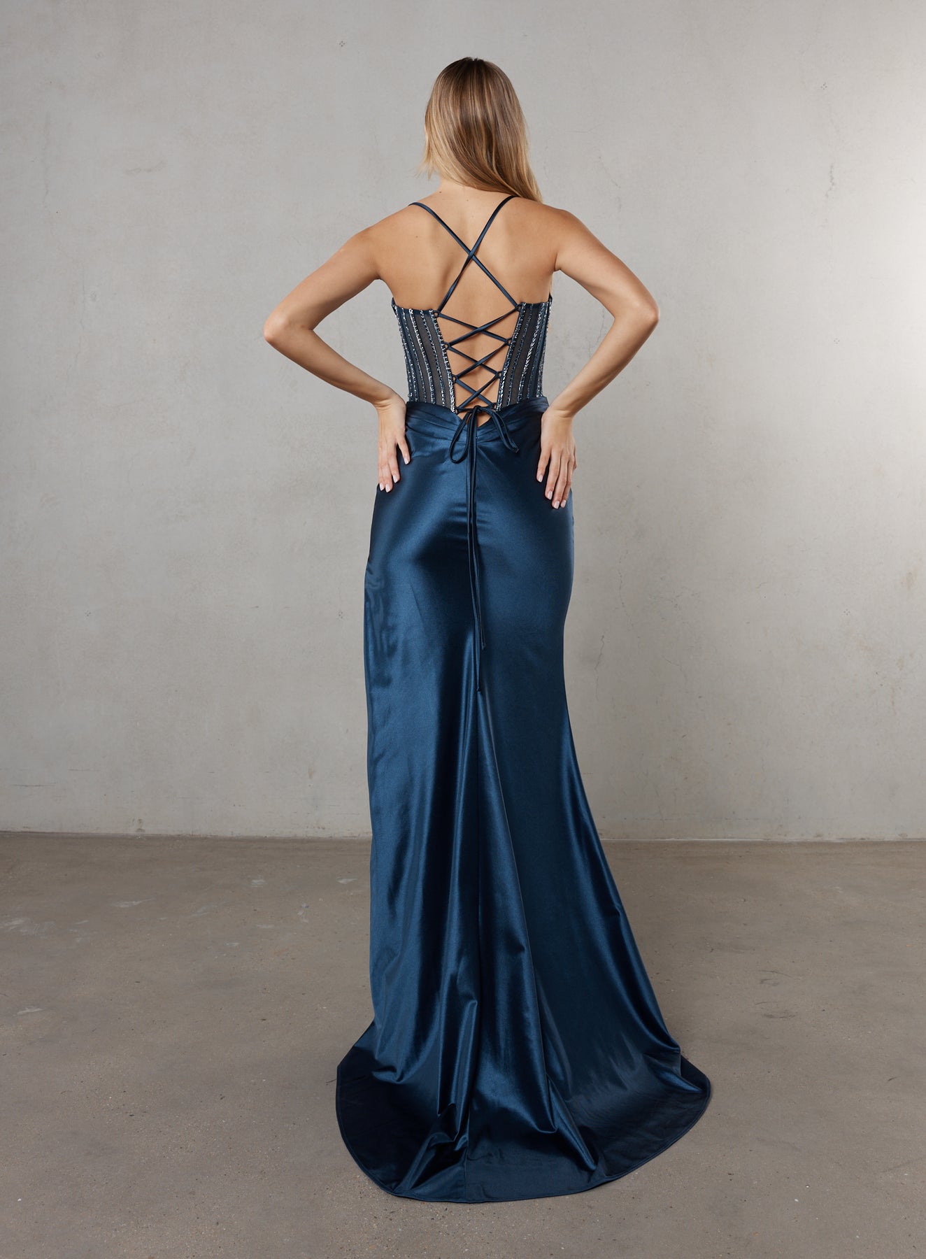 A sweetheart neckline with pleated drape detailing and delicate beading enhances the romantic appeal, while spaghetti straps that lace up at the back add an alluring, adjustable finish. The draped midsection folds into a soft V-shape, subtly defining the waist and creating a flattering silhouette. A side high-leg split completes the look with modern sophistication and graceful movement.