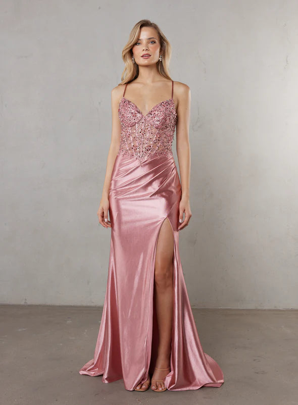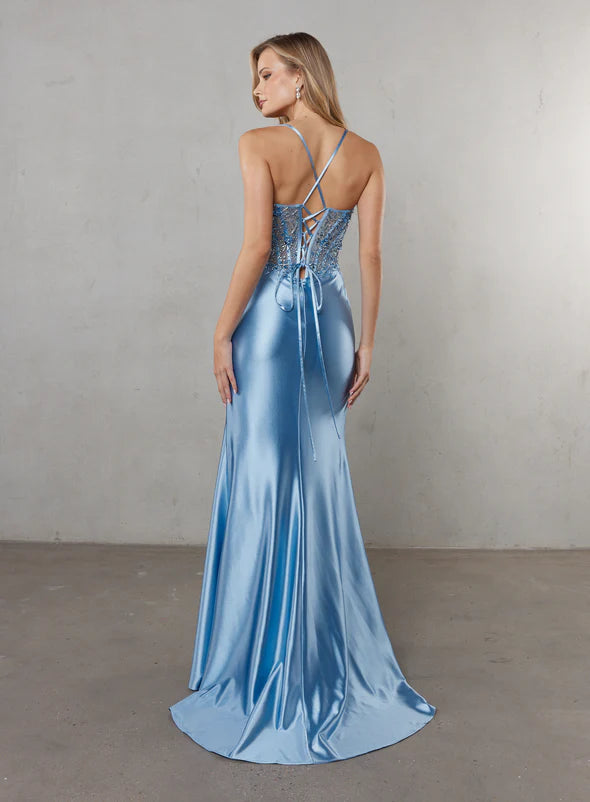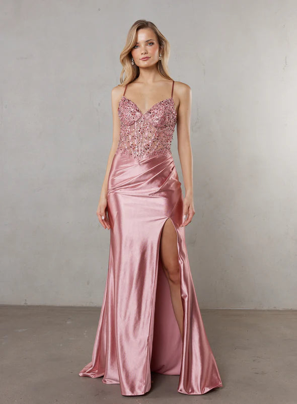 Meet Frankie—the dress that knows how to make an entrance. Built on a foundation of structured boning and integrated support, this gown pairs an illusion corset bodice with beaded lace appliqué that catches every light. Stretch satin glides effortlessly over your frame, while the plunging V-neckline and lace-up back straps deliver pure drama. A thoughtful drape at the mid-section keeps things balanced against the show-stopping high-leg split. Sophisticated, a touch daring, and undeniably unforgettable.