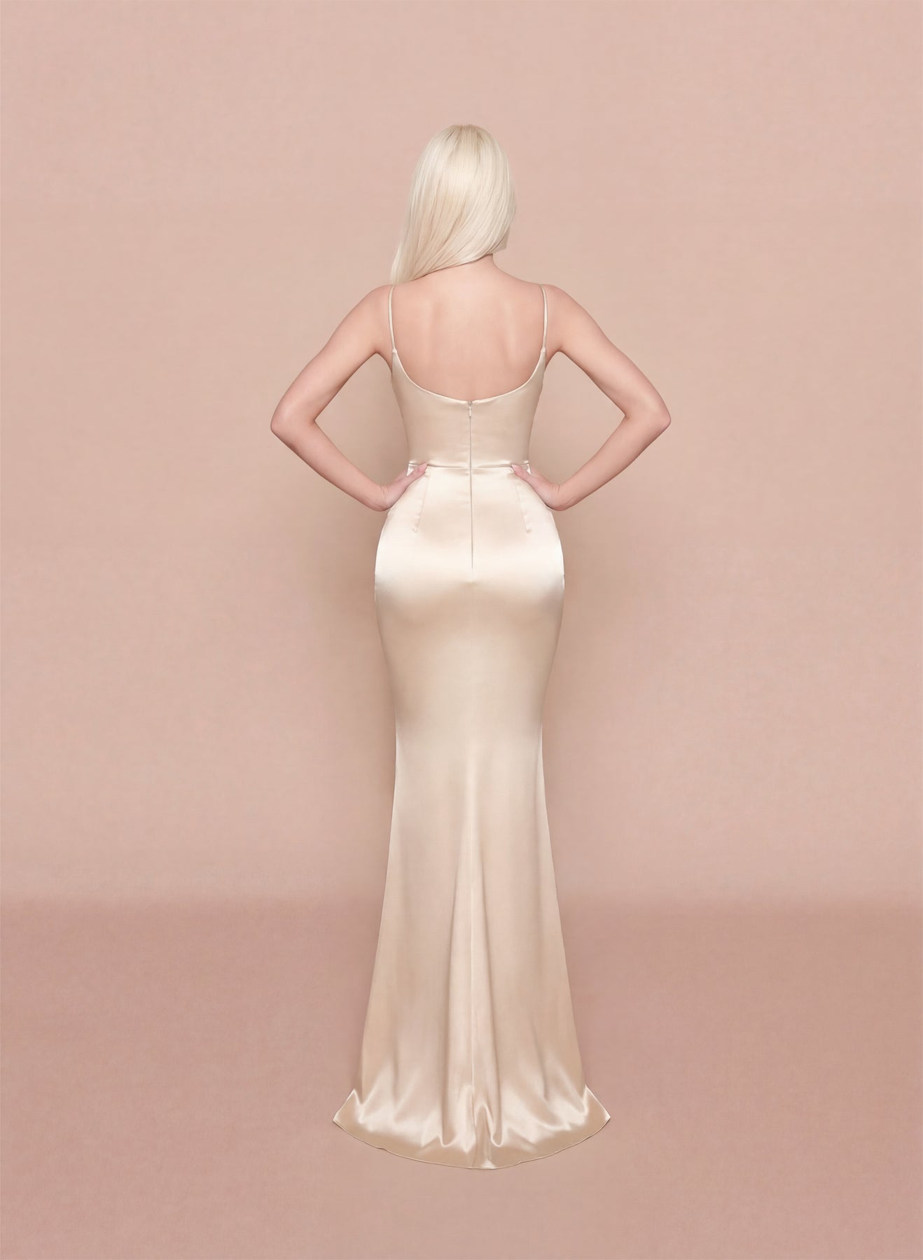 Soft ruching across the bodice and waist enhances the silhouette, creating a sculpted and figure-flattering fit. The fitted design flows into a sleek floor-length skirt with a sophisticated thigh-high split, adding graceful movement and a touch of modern allure.