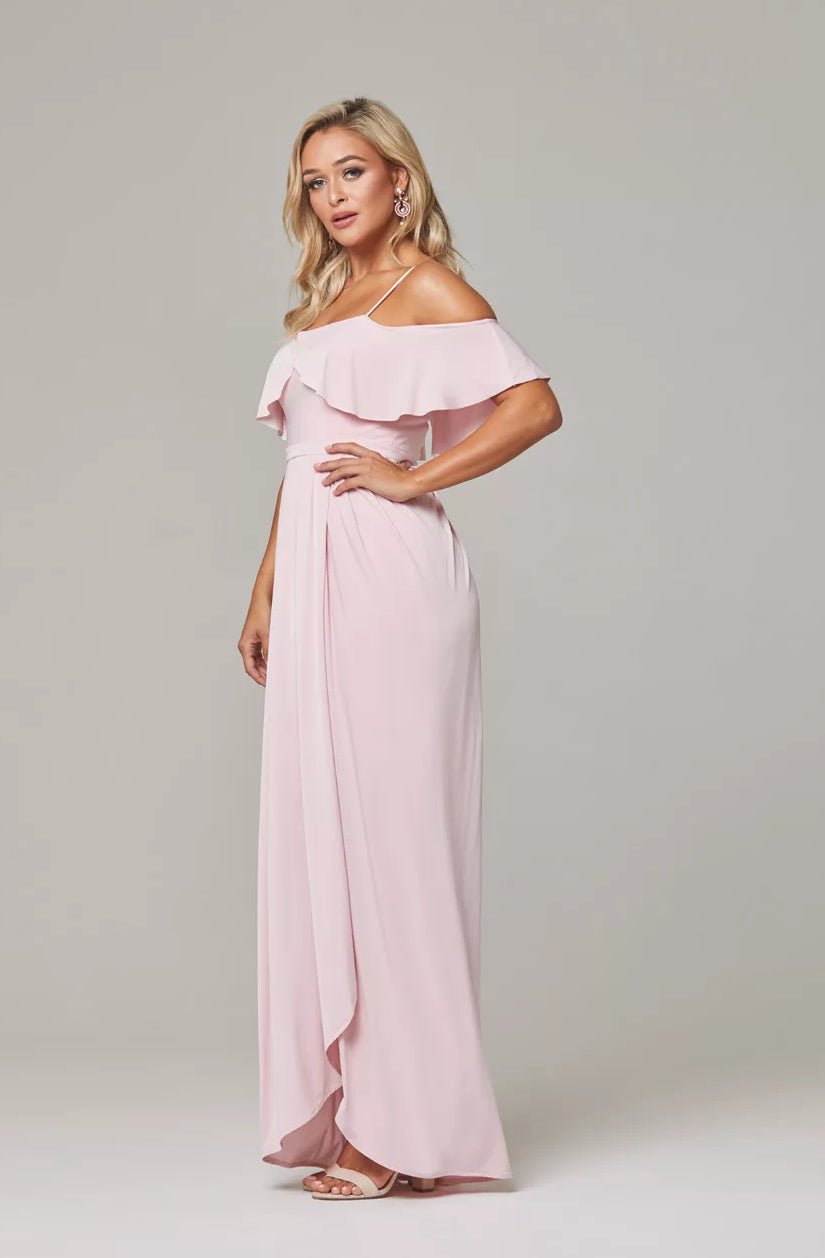 This contemporary off the shoulder soft Jersey knit gown cascades to a subtle skirt split. Colour Swatches available In Store.
