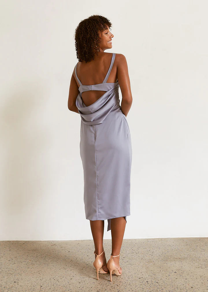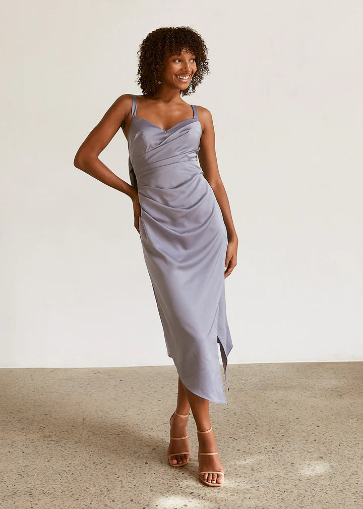 Introducing Zelkova, a timeless choice for your bridal party. Available in Powder Blue, Champagne, Rose, Sea Mist, and Navy, this dress features a sweetheart neckline with pleated draped bodice detail, wide-set straps, and a flattering pleated waist. The crossover centre front split adds allure, while the cowl back with a wide backstrap offers a modern touch. With built-in bra cups and boning, Zelkova ensures comfort and support. Complete with an invisible zip closure,