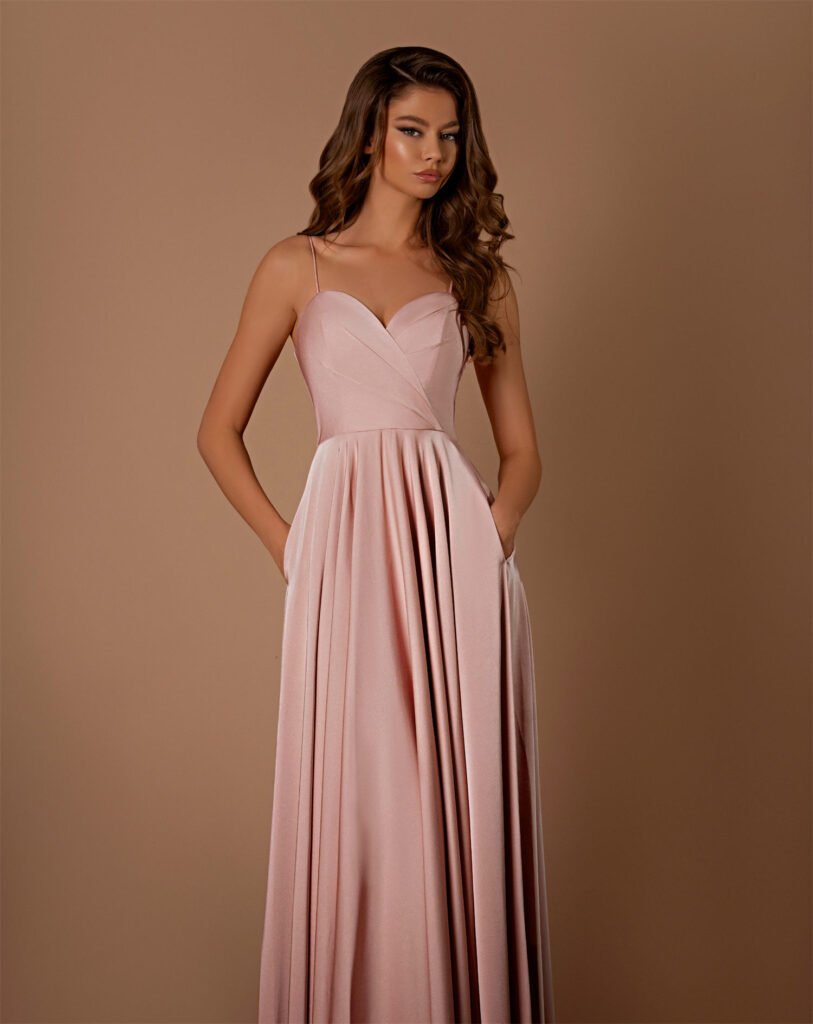 Elevate your style with the Rana Dress by Les Demoiselle. This elegant A line silhouette features delicate spaghetti straps and a cross over ruched bodice for a flattering fit. The cinched waist and flowing skirt with pockets add a touch of luxury to this classic design. Perfect for any occasion.