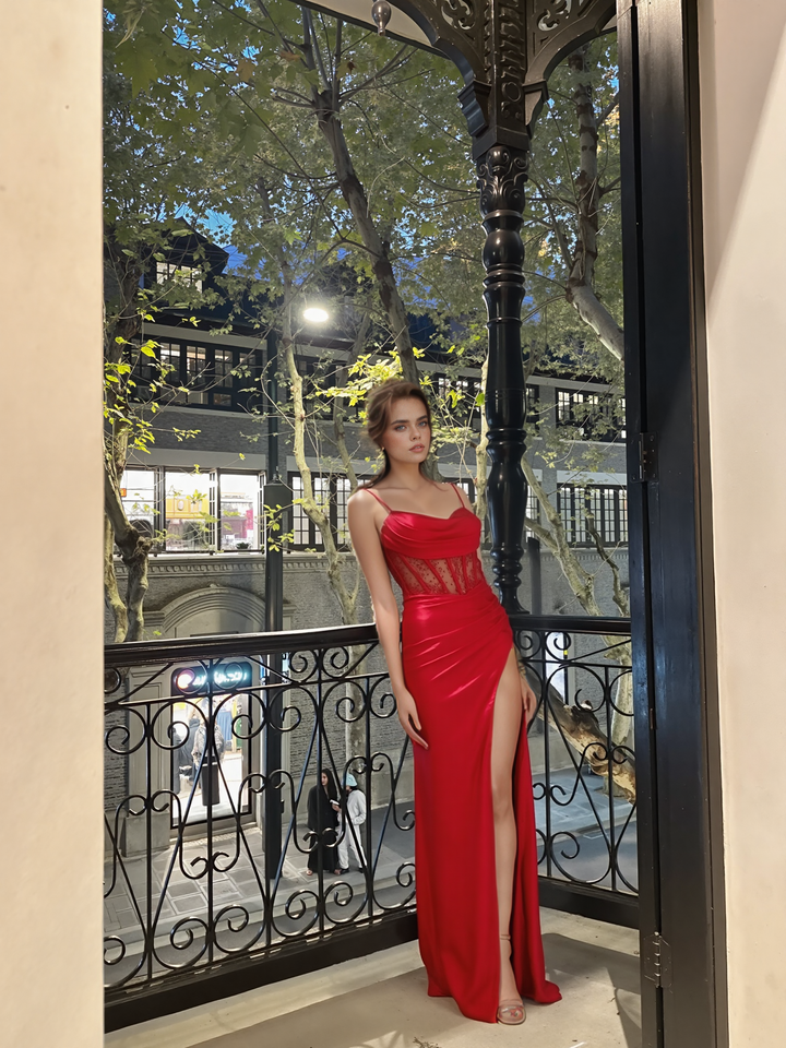 Designed with comfort and support in mind, delicate spaghetti straps and built-in bra cups ensure a flawless fit that allows you to move with confidence. The fitted silhouette, enhanced by ruched front detailing, effortlessly accentuates your curves, while a daring thigh-high split adds an unexpected edge to the look. Complete with a lace-up back detail and invisible zip closure, Belladonna offers both style and practicality, ensuring a seamless finish from every angle.