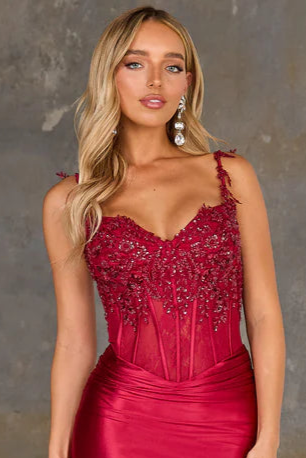 The dropped V front waistline adds a sophisticated touch, while the detachable flat lace beaded straps provide versatility in styling. The fitted mermaid skirt, featuring upper hip gathers, beautifully accentuates the figure.