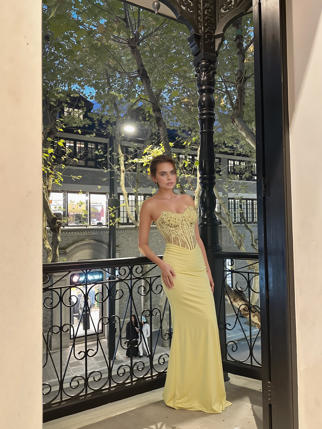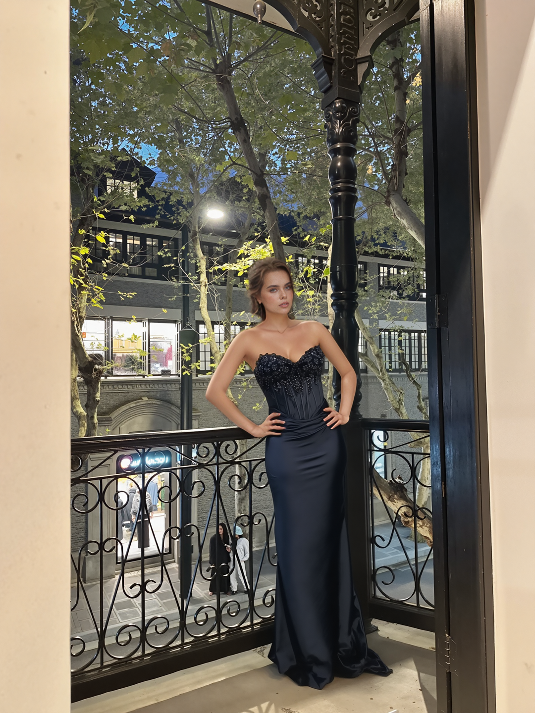 Introducing the Kiki dress, a stunning fusion of elegance and intricate detail. This remarkable piece features a sweetheart peaked neckline complemented by an exposed boned soft lace bodice, adorned with beaded lace appliqué that enhances both the under and over bustline.
