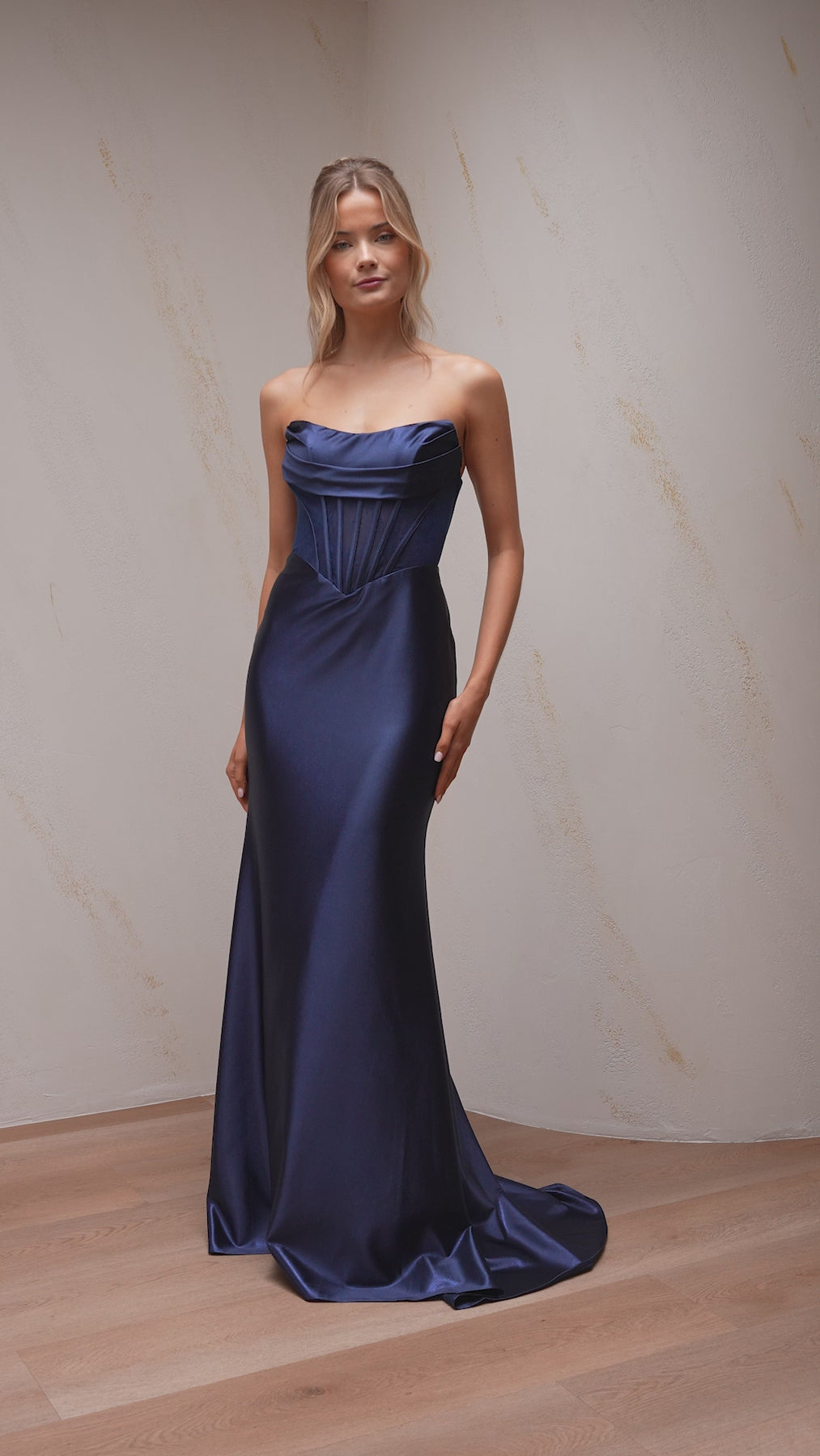 • Draped satin across the bust line for added detail