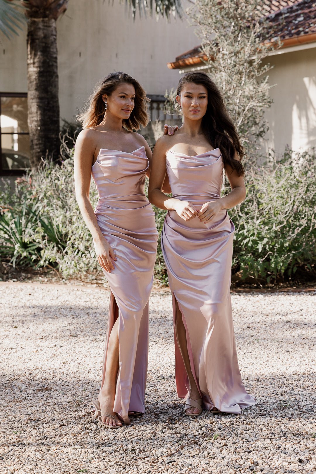 The Colette TO899 Bridesmaid Dress is a strapless, cowl neckline, floor length, stretch satin wedding guest gown available in sizes AU 4-30.