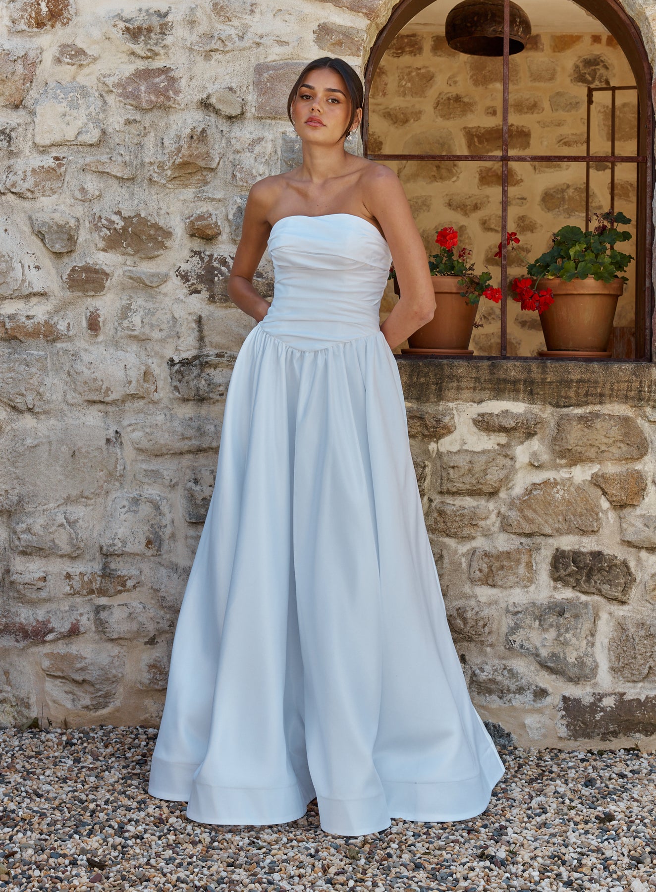 The gathering continues through the back, which is finished with an invisible zipper closure for a clean and refined look. The Dolly Debutante Dress blends classic debutante styling with thoughtful detailing for a timeless silhouette.