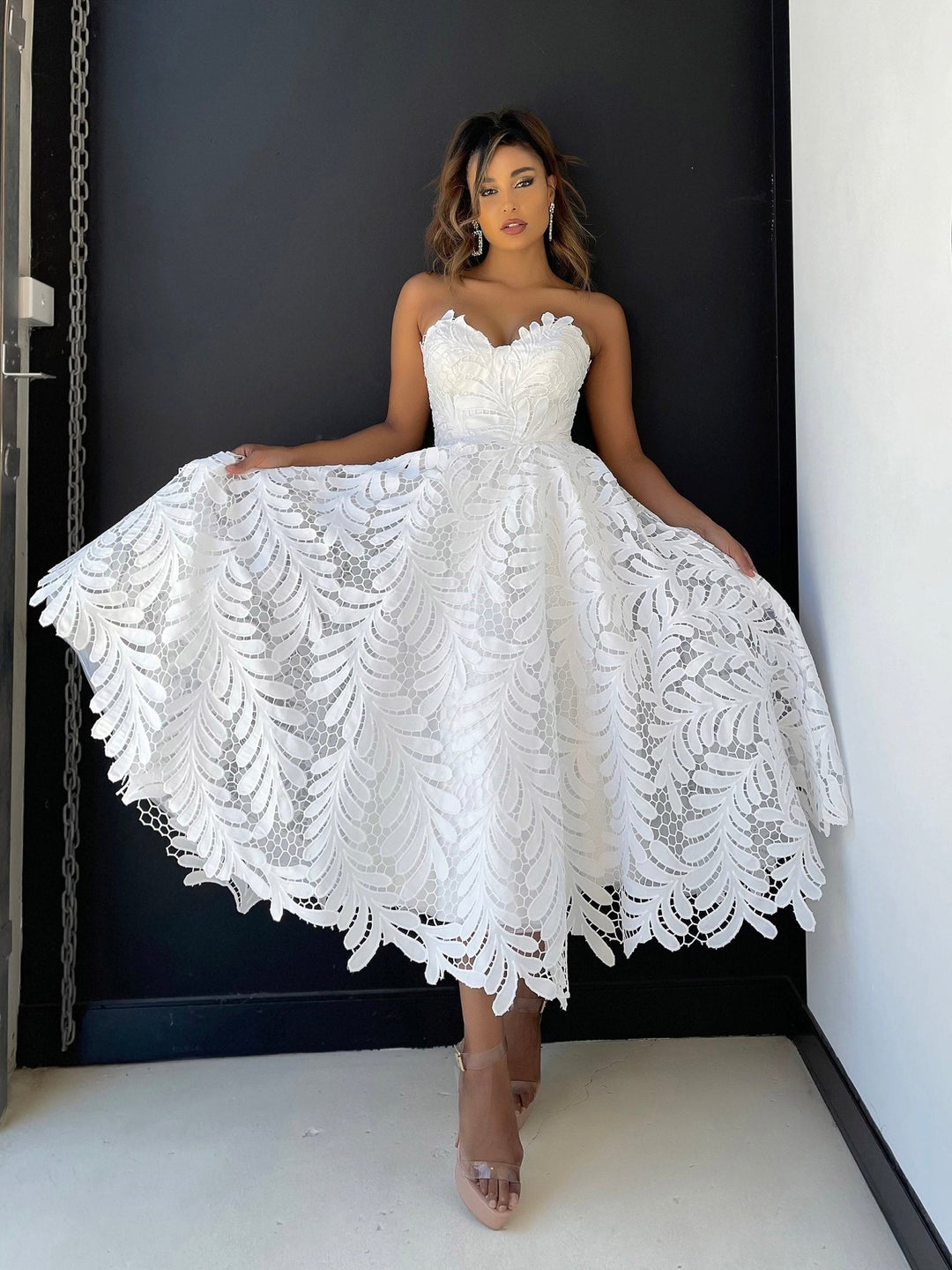 Sweet new strapless midi features a sweetheart neckline, cinched waist and flared out classic A line skirt. Adorned with lace detailing.
