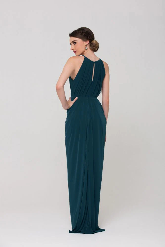 Alluring and modern the stunning Sandra bridesmaid dress is a fresh look for any bridal party. Designed with our Luxe jersey fabric the flattering high neckline and cinched waist is perfect for all shapes and sizes. With a tasteful front side split you can move with ease and dance the night away. Light gathers from the waist band fall into a slim line skirt slightly teared through the front. An invisible zip and slit keyhole back for a smooth finish compliments this effortless piece.