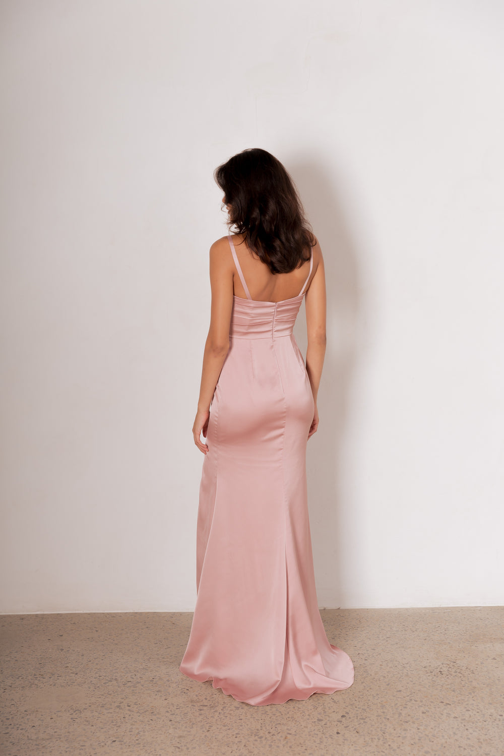 Pleated detailing across the bodice and midsection accentuates the waist, creating a beautifully sculpted look. A floor-length skirt with a high-leg split adds graceful movement and a touch of allure. Fully lined for a smooth, comfortable fit, the gown is finished with an invisible zip closure at the back for a seamless, polished finish.
