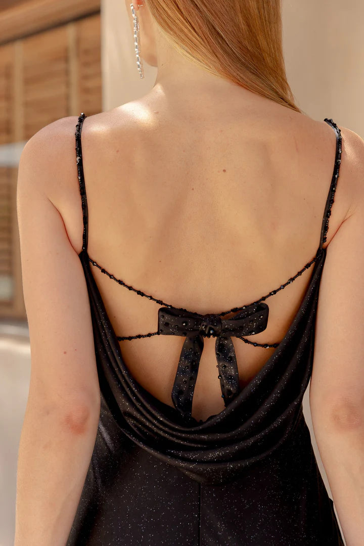 Turn heads in our glamorous Mavi Formal Dress, crafted from sparkle stretch satin jersey knit that skims the figure in a sleek, fitted silhouette. The cowl neckline at the front and back is paired with delicate beaded spaghetti straps, adding an elegant touch of shimmer. A daring high-leg split brings modern allure, while the beaded bow detail across the back creates a striking, romantic finish. Completed with an invisible zip closure, this gown blends sophistication and contemporary glamour for any unforgettable occasion.